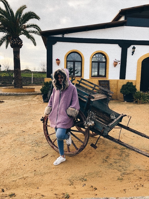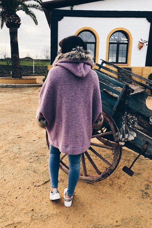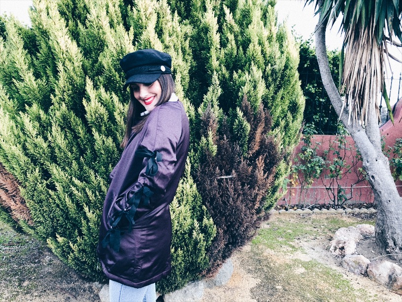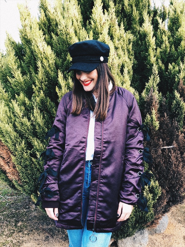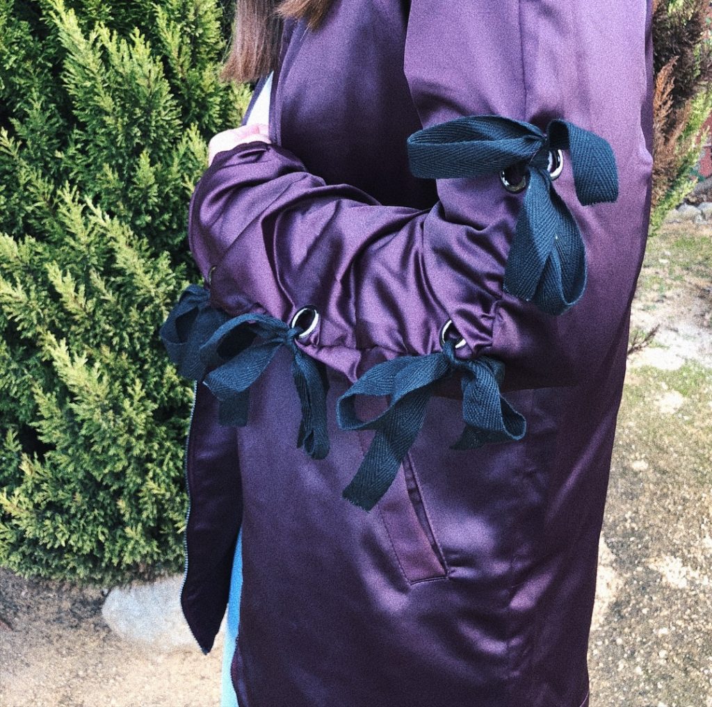 El look jeans, zapas y camisa tiene una apuesta más, esta bomber morada larga con lazos en las mangas. Su tejido, como podéis observar en las fotografías, es brillante, de raso. Súper calentita y cómoda. Las bomber y jackets largas es una de las tendencias de esta temporada.