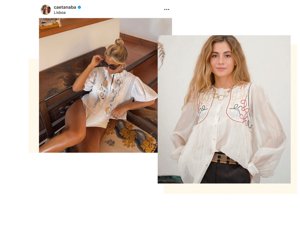 Las blusas bordadas dan una versatilidad fundamental en el estilo de "Portuguese Girl". Estas prendas se pueden llevar en ocasiones casuales o en ocasiones formales, sólo depende de los accesorios que lleves o la forma de combinarlas. Caetana Botelho luce una blusa bordada que le queda ideal. Una de las opciones que ofrecemos es nuestra camisa Hippie Chic.