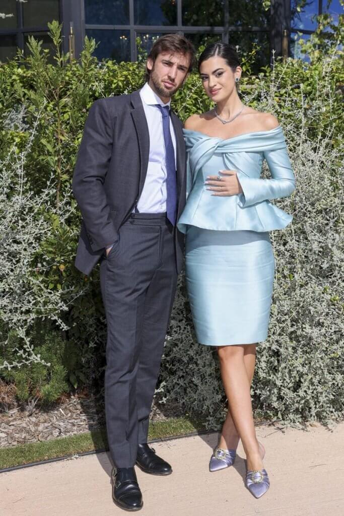 La influencer, que está embarazada de su primer hijo, ha elegido un look de Pronovias de estilo similar al que llevó hace un par de semanas en el hipódromo, un conjunto en tono azul celeste compuesto por cuerpo de escote ‘Bardot’, manga larga y detalle péplum y falda recta hasta las rodillas. Ha completado con zapatos destalonados e impresionantes joyas vintage.