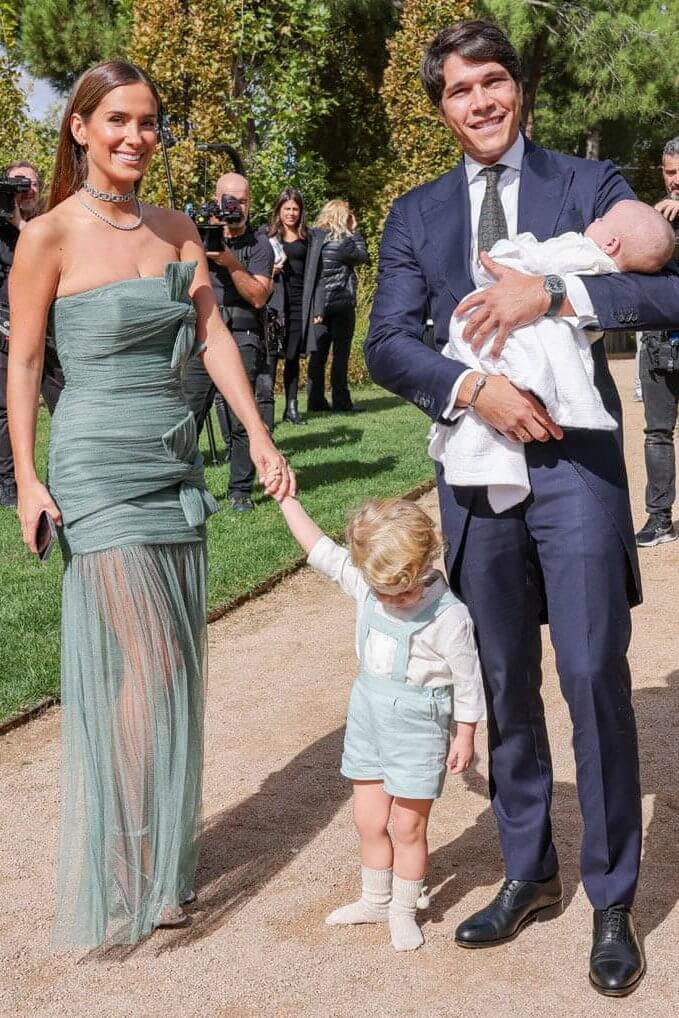 La hermana pequeña de Marta ha brillado con un vestido exclusivo de Redondo Brand en tono verde salvia -mismo tono que los petitos de sus hijos-, una pieza con escote palabra de honor, confeccionada en tul de seda y decorada con lazadas frontales.