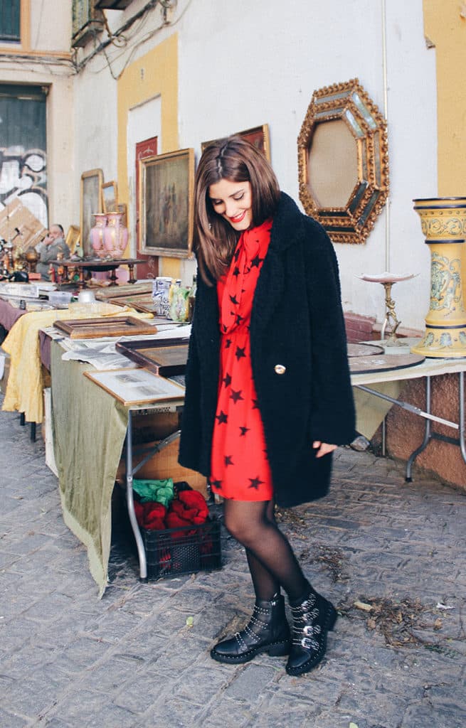 El mercado es característico por la venta de antigüedades y reliquias, así como de artículos u objetos de segunda mano que los vendedores revenden o se han encontrado. Una vuelta a la Sevilla del siglo XVIII, que no podrás perderte si quieres regresar al pasado y recorrer sus calles para conocer el encanto de la capital andaluza. Look-vestido-estrellas-mariquitatrasquila Y como solemos decir... "Una imagen vale más que mil palabras". Rebozamos alegría, felicidad, el vestido estrella y ese precioso lugar, nos alejan de la realidad... SOÑEMOS... Look-vestido-estrellas-mariquitatrasquila Look-vestido-estrellas-mariquitatrasquila Un vestido rojo de estrellas negras suelto es de manga larga, con corte en la cintura para realzarla y una lazada en el cuello. Además, ¿sabes qué? Es talla única, aproximadamente de una 36-42, pero como mejor puedes comprobarlo es probándotelo. Como ves, el largo es hasta casi la rodilla. Te proponemos este look para un sábado de almuerzo, para ir a trabajar, para ir a clase o donde quieras ir a sentirte como una estrella o por qué no, miles de estrellas como las de tu vestido. ¿Recordáis que os dijimos en el anterior post que habíamos traído nuevos botines de hebillas? Mmmmm sí!!!! Estos son.