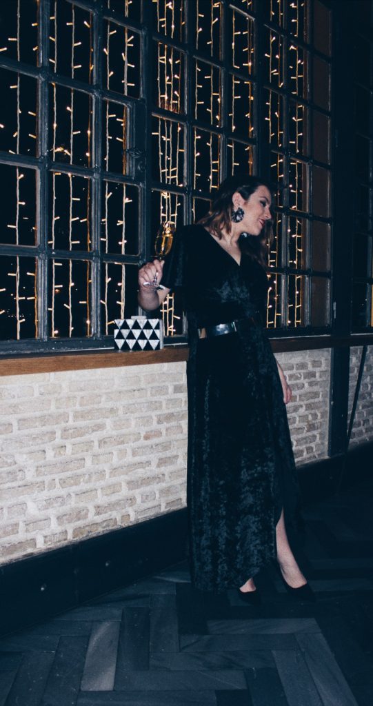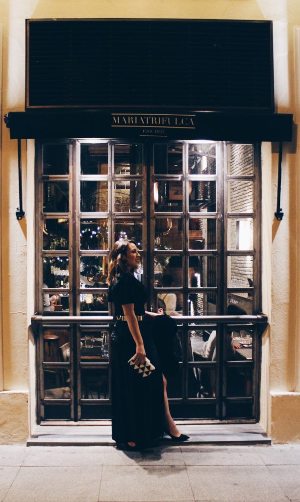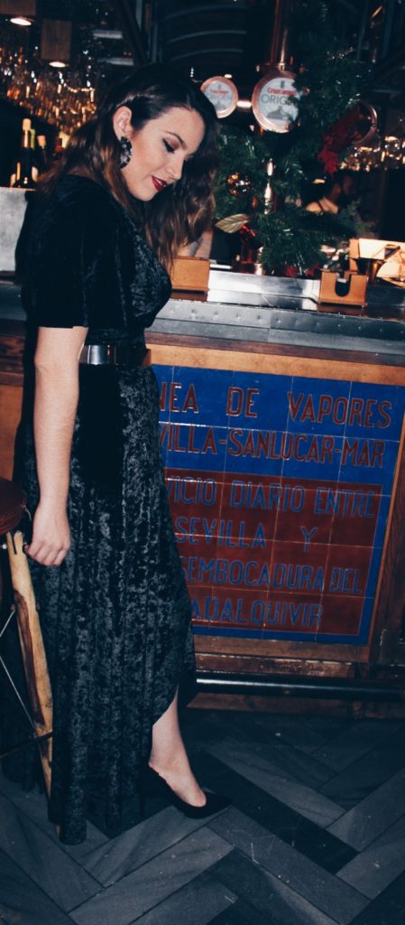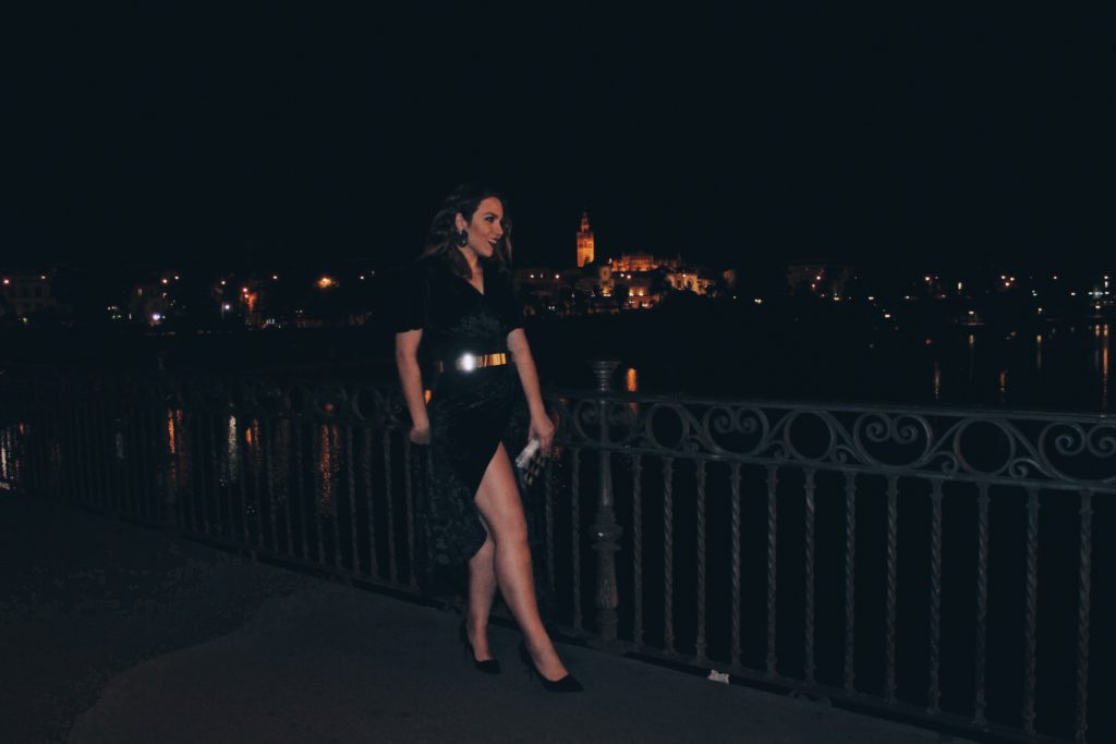 María Trifulca recibió la visita de una de nuestras Ladybirds en víspera de las fiestas navideñas. Te invitamos a acompañar a María en una bonita velada con unas maravillosas vistas sobre el Puente de Triana en Sevilla. Puedes ir tanto de día como de noche, eso sí, te recomendamos reservar porque normalmente está completo. Si tenemos que hacerte alguna recomendación en cuanto a qué pedirte, todo está espectacular. La mezcla de sabores de sus platos te dejará boquiabierta. María nos recomienda: el Tartar de atún, las milhojas de queso de cabra con manzana y foie, cualquiera de sus arroces, los chipirones, el tataki de salmón y de postre: la torrija caramelizada... Riquísimo, ¿verdad? María apostó por un vestido largo negro de terciopelo de manga corta, caído desde la cintura, con un tejido muy fino y calentito, que no dejará que pases frío allá donde lo lleves. ¡Serás el centro de todas las miradas! El vestido que llevó María en esta ocasión es talla única y además, tiene una raja espectacular desde la cintura hasta los pies.