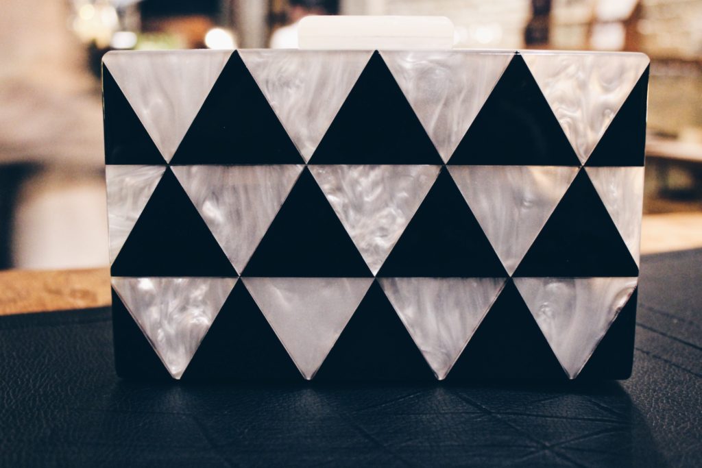Nuestro aliado para complementar este vestido negro largo, fue el nácar. Unos pendientes redondos de nácar de tonos negros y blancos. Y una cartera cuadrara de nácar formando rombos blancos y negros.